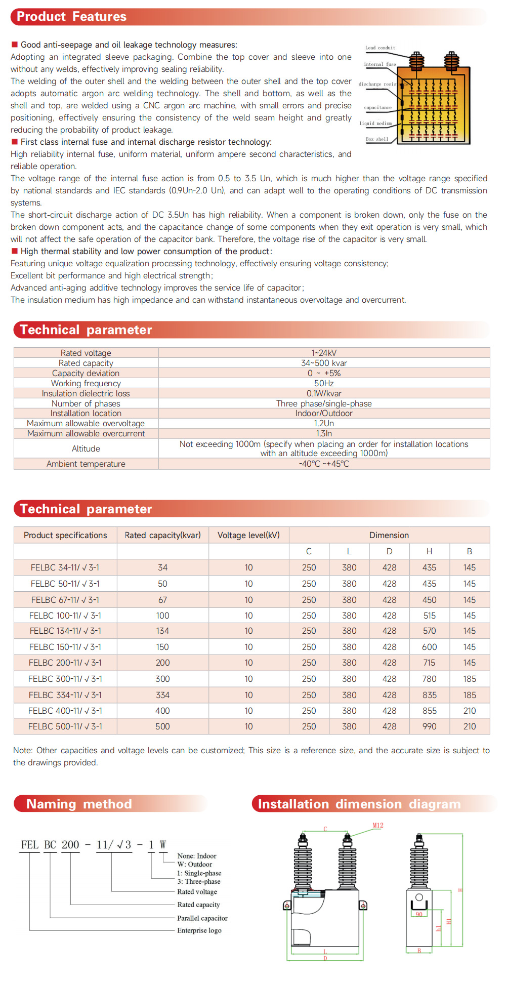 - FELBC high-voltage parallel capacitors are mainly used in power supply systems above 1kV, connected in parallel to the grid to improve grid quality, increase system power factor, reduce line losses, and enhance the efficiency of power supply equipment.