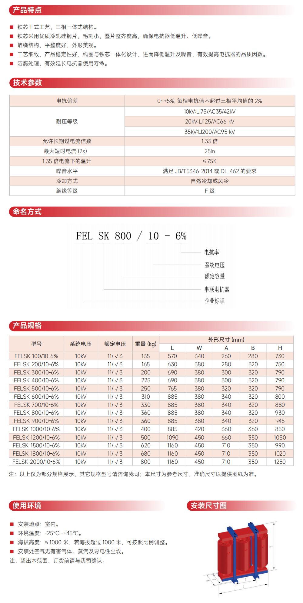 FELSK系列电抗器结合了干式变压器的设计工艺与电抗器专有浇铸工艺及噪音控制技术。FELSK系列电抗器具有绝缘强度好、局放小、漏磁少、过载能力强、机械强度高、损耗低、体积小、噪音低、可靠性高等优点,可广泛应用于输配电系统、钢铁冶金、石油化工、机械制造等领域。