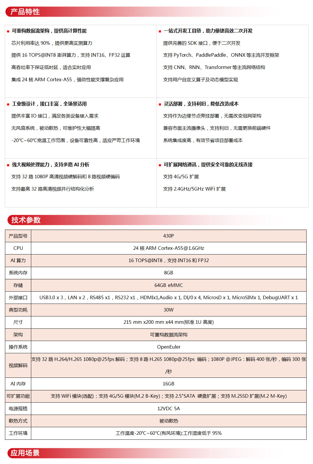 • 基于全球领先的数据流架构CAISA 430,最大化利用芯片资源,提供16TOPS峰值算力,最高支持32路高清视频解码和实时智能分析,搭载3×8核ARM Cortex-A55处理器,强劲性能,可广泛应用在智慧城市、智慧交通、智慧能源、智慧安监等领域。