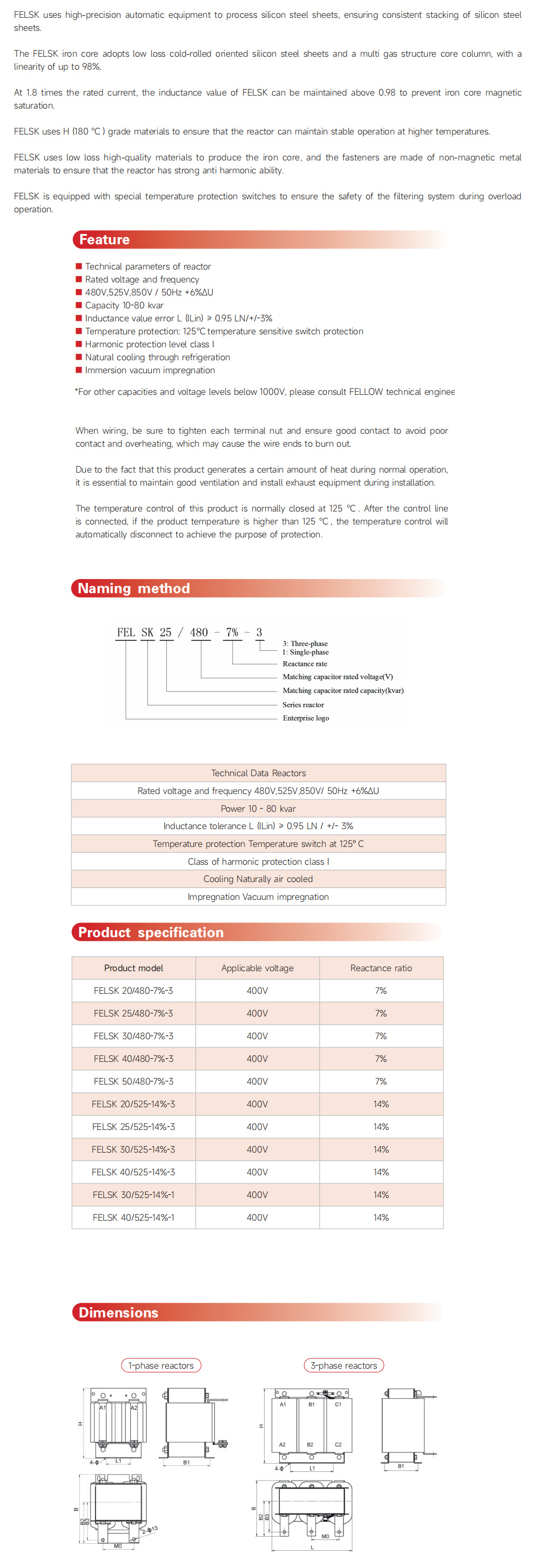 - FELSK energy-saving reactors are used in low-voltage reactive power compensation cabinets.Parallel connection with capacitors. When there are a large number of harmonics in the low-voltage power grid, it will seriously endanger the safe operation of the main transformer and other electrical equipment. After connecting reactors and capacitors in series, it can effectively suppress grid harmonics, prevent harmonic amplification, and effectively suppress closing inrush current and