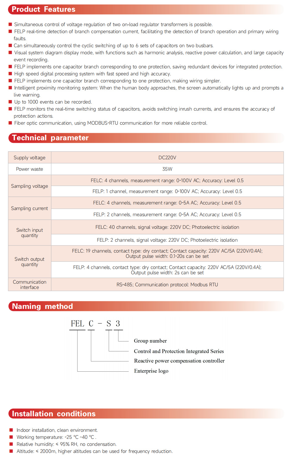- The FELC-S high-voltage reactive power compensation control system consists of a high-voltage reactive power compensation controller FELC-S and a highvoltage capacitor protector FELP, which can intelligently manage the switching and protection of each compensation branch.