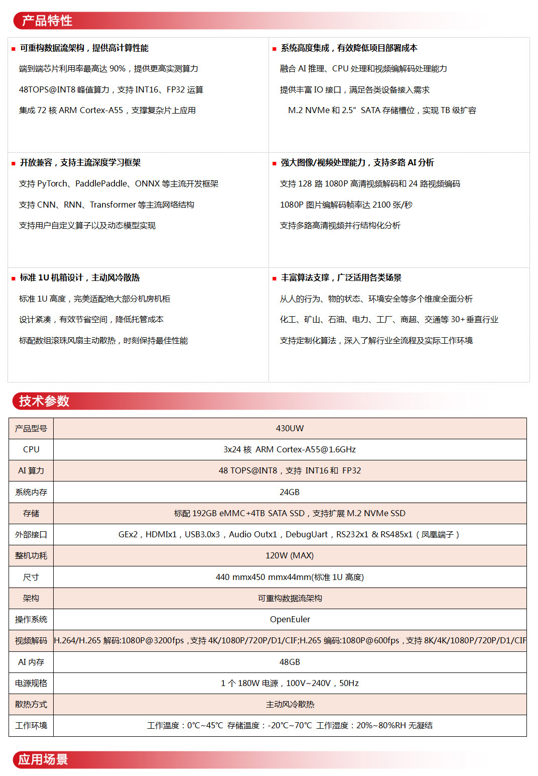 • 基于全球领先的数据流架构CAISA430,最大化利用芯片资源,提供48TOPS峰值算力,支持64路视频实时智能分析,搭载72核ARM Cortex-A55处理器,强劲性能,可广泛应用在智慧能源、智慧城市、智能制造、智慧安监等领域。