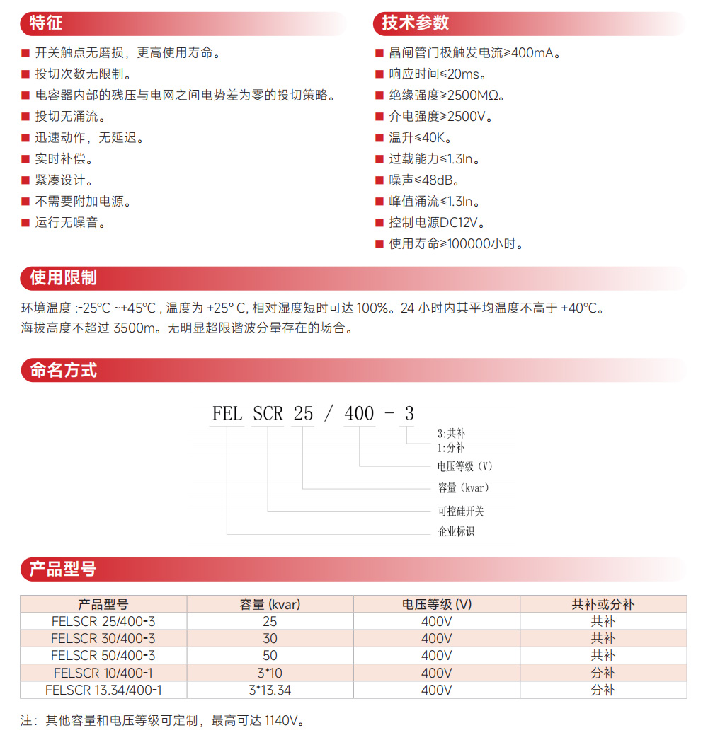 FELSCR 系列可控硅开关适用于谐波电流畸变率较高或者是负载电流变化较快的生产场合,替代电容器专用投切接触器使用。