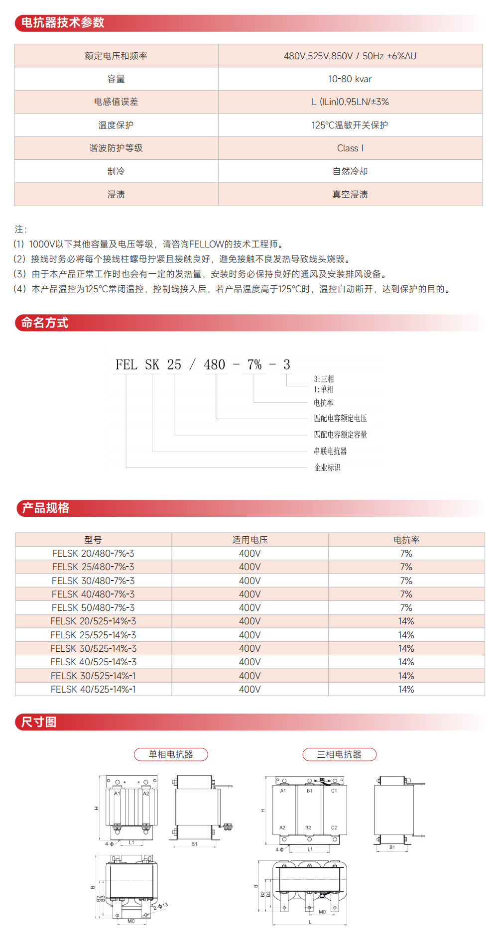 • FELSK节能型电抗器用于低压无功补偿柜中,与电容器并联,当低压电网中有大量谐波时,会严重危害主变压器及其他电气设备的安全运行。电抗器与电容器串联后,能有效抑制电网谐波,防止谐波放大并能有效的抑制合闸涌流及操作过电压,有效保护电容器。电抗器线圈采用独特绕制工艺,有效地解决电抗器散热的问题。