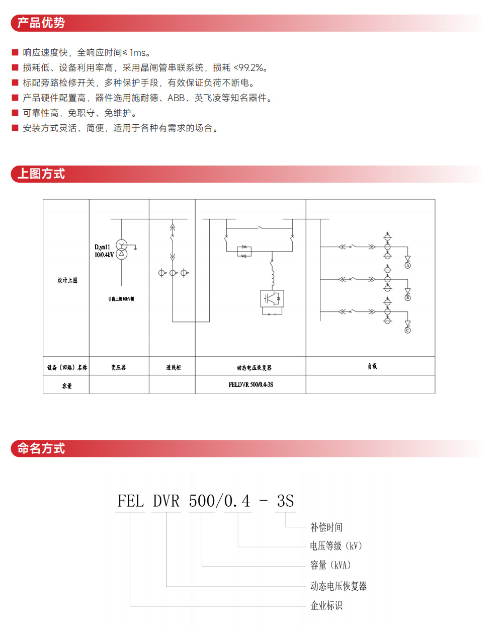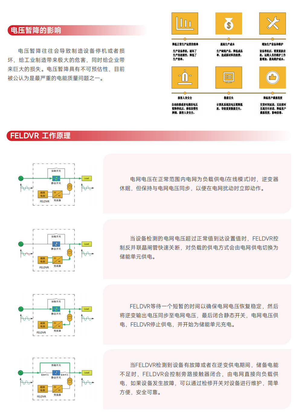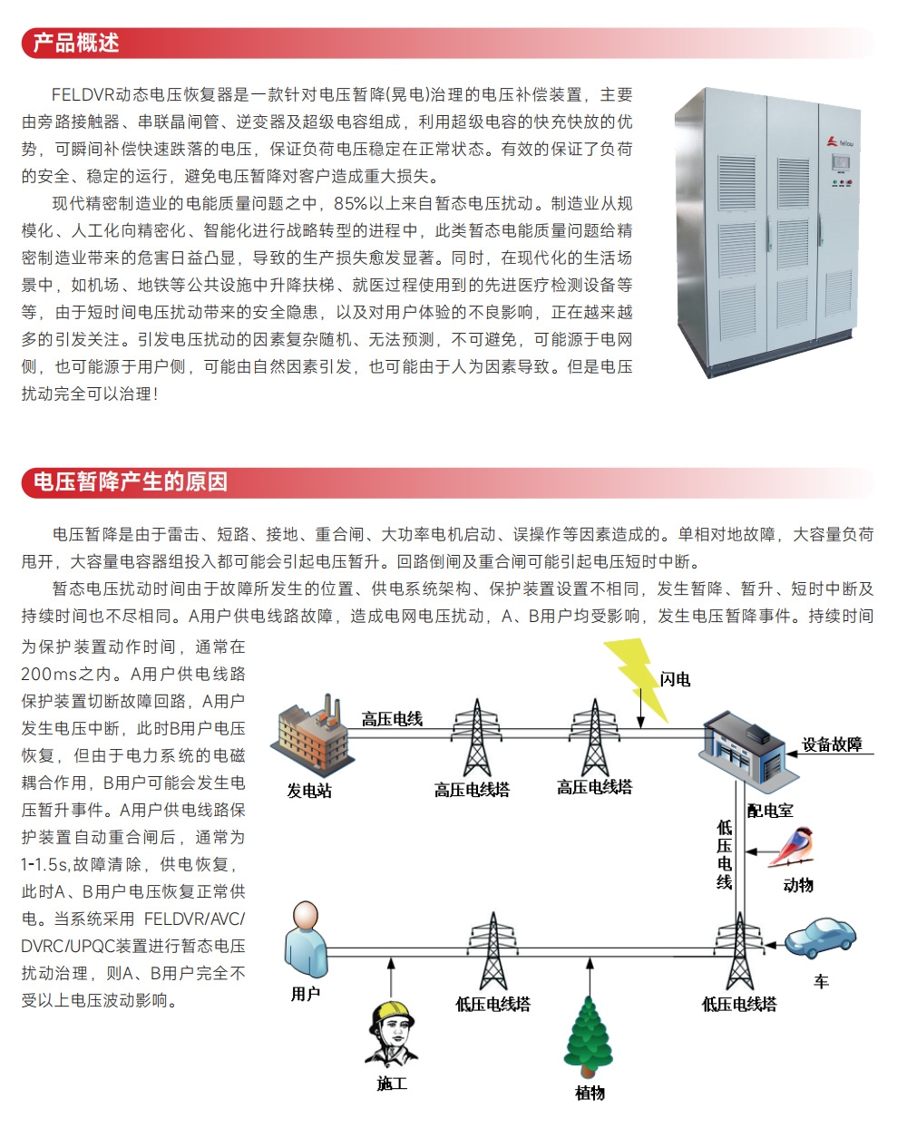 • FELDVR动态电压恢复器是一款针对电压暂降(晃电)治理的电压补偿装置,主要由旁路接触器、串联晶闸管、逆变器及超级电容组成,利用超级电容的快充快放的优势,可瞬间补偿快速跌落的电压,保证负荷电压稳定在正常状态。有效的保证了负荷的安全、稳定的运行,避免电压暂降对客户造成重大损失。