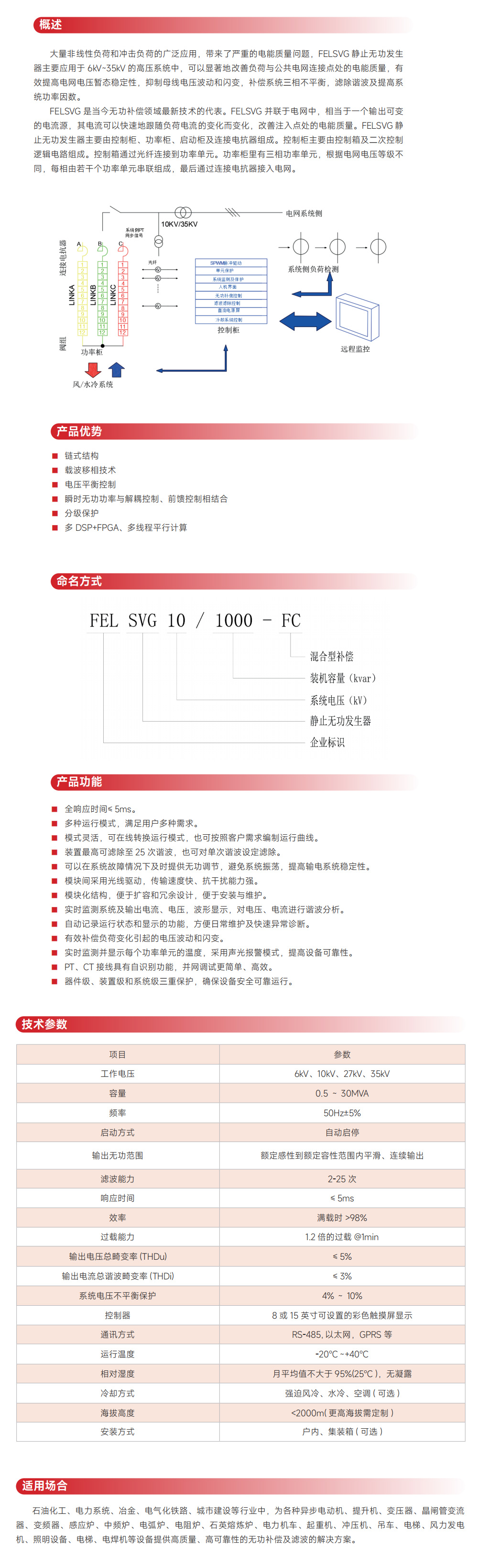 • 大量非线性负荷和冲击负荷的广泛应用,带来了严重的电能质量问题,FELSVG 静止无功发生器主要应用于 6kV~35kV 的高压系统中,可以显著地改善负荷与公共电网连接点处的电能质量,有效提高电网电压暂态稳定性,抑制母线电压波动和闪变,补偿系统三相不平衡,滤除谐波及提高系统功率因数。