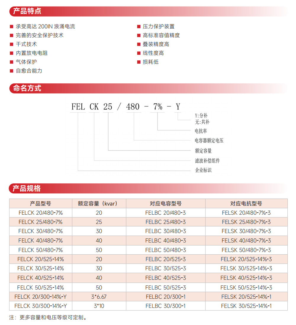 • FELCK 滤波组件是一种根据负载情况,将电容器、电抗器按需求配置进行组合,具备无功补偿和谐波抑制功能的补偿单元。