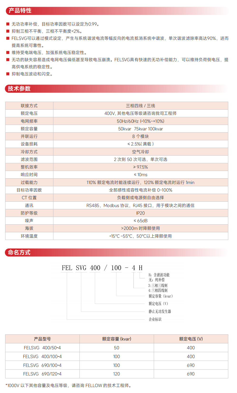 • FELSVG是集无功补偿、三相不平衡治理、谐波治理及抑制电压闪变为一体的先进性电力电子装置。采用电压源型逆变器的补偿方式,不受系统阻抗限制,能够对无功功率、三相不平衡以及谐波进行实时跟踪补偿,从而为电网或用电负荷提供快速动态无功补偿和谐波滤除,可有效提高负荷功率因数、补偿三相不平衡负荷、抑制母线电压闪变、滤除负荷谐波及提高电网电压暂态稳定性。