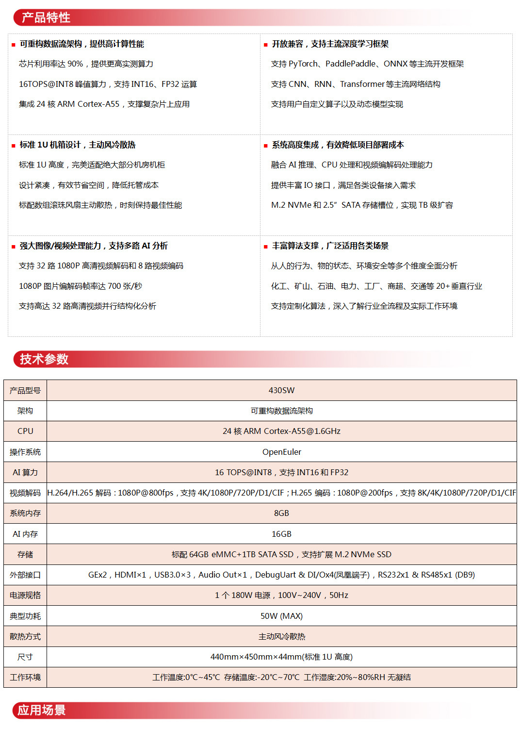 • 基于全球领先的数据流架构CAISA 430,最大化利用芯片资源,提供16TOPS峰值算力,支持16路视频实时智能分析,搭载24核ARM Cortex-A55处理器,强劲性能,可广泛应用在智慧能源、智慧城市、智能制造、智慧安监等领域。